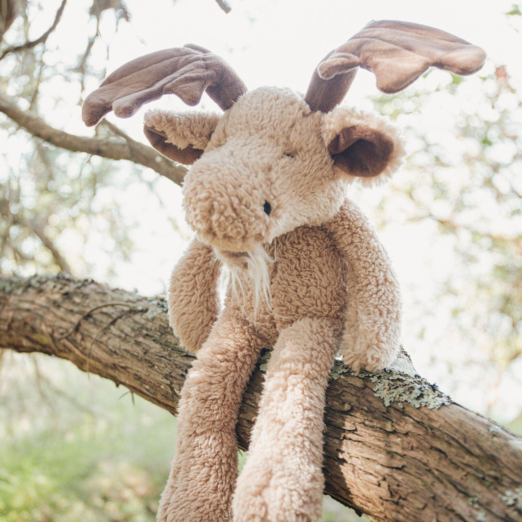 Bruce the Moose - is super soft fur in warm taupe with acorn brown antlers. Embroidered face and a handsome goatee under his chin. This woodland friend is the Hero of our hearts, and our Camp Cricket Book.