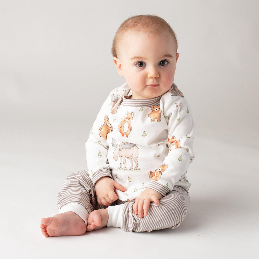 Little ones will be super comfy exploring the world dressed in their comfy Camp Out top and pants. Soft cotton knit character print with all your camp cricket woodland animal friends including Bruce the moose, Foxy the fox, Roxy the Raccoon, and Cubby the bear with tents and trees. coordinating brown and white stripe pull on pants. Our baby apparel items are sure to please even the choosiest little ones with the soft fabrics, fun prints, and easy care. Who knew baby clothes could be so much fun?