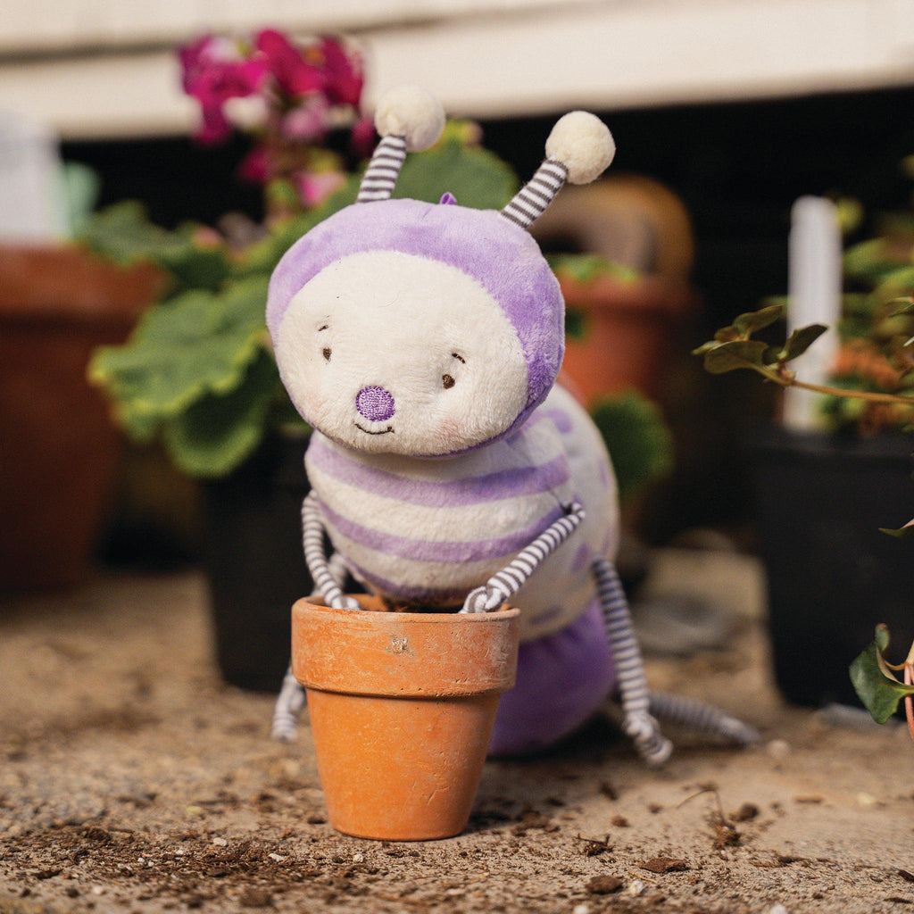 Caterpillar, a special garden plush friend that’s as playful as a springtime breeze. Caterpillar’s body is soft, velour delight with a lovely purple and cream patterns, reminiscent of the garden’s most enchanting flowers.
