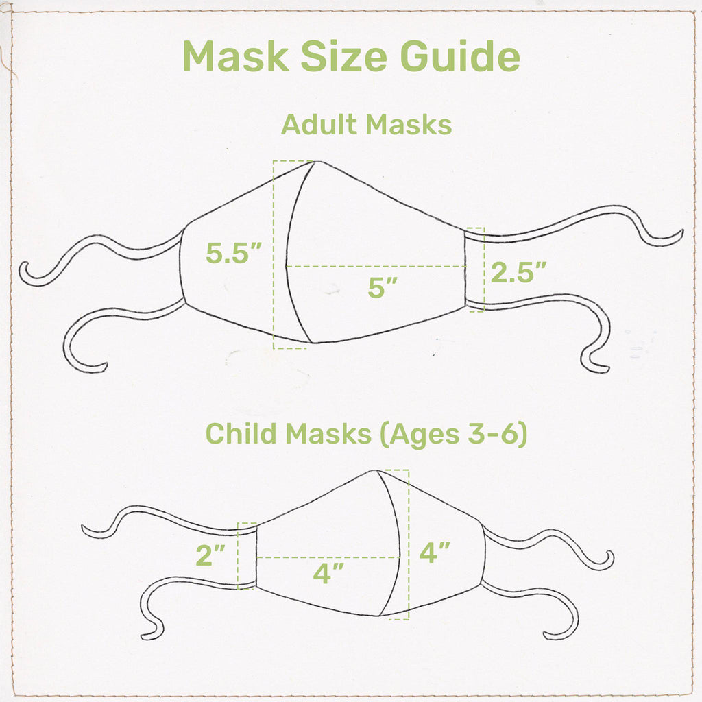 - Adult Masks: 5.5" in height at center, 5" from the center point to each side, and 2.5" in height at ties.