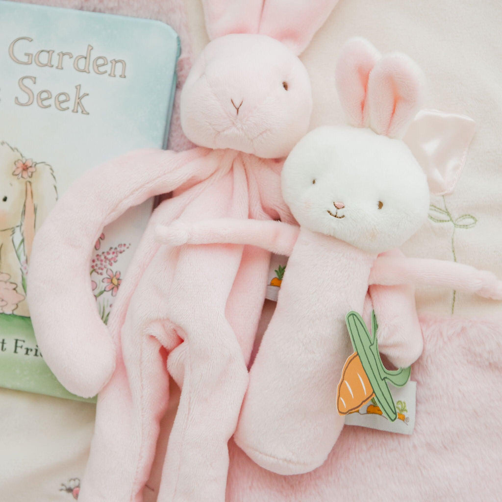 Friendly Chime Bunny is made of soft pink velour with adorably perky bunny ears and hand-embroidered details for the bunny face, with pinked cheery cheeks, and soft dangling arms for chewing and soothing.