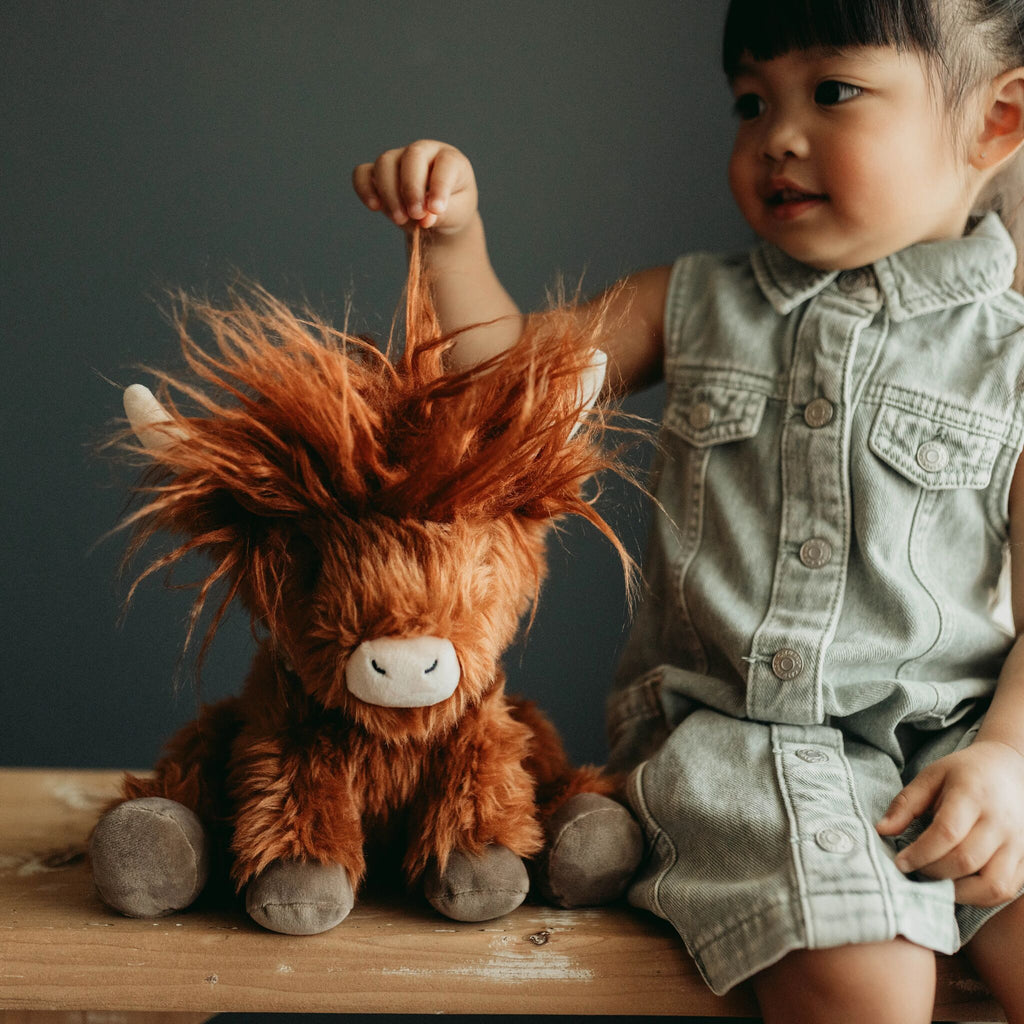 Say hello to Hamish the plush Highland Cow, a cuddly companion from the coziest countryside! With burnt orange fur that’s soft and shaggy, a charming tuft atop his head and at the end of his tail, Hamish is full of farmyard flair. With Velour nose and hooves add a gentle touch, and sweet handkerchief is perfect for a personalized stitch of love. A delightful stuffed animal friend with a whole lot of heart – Hamish is here for hugs, play, and a wee bit of Highland charm!