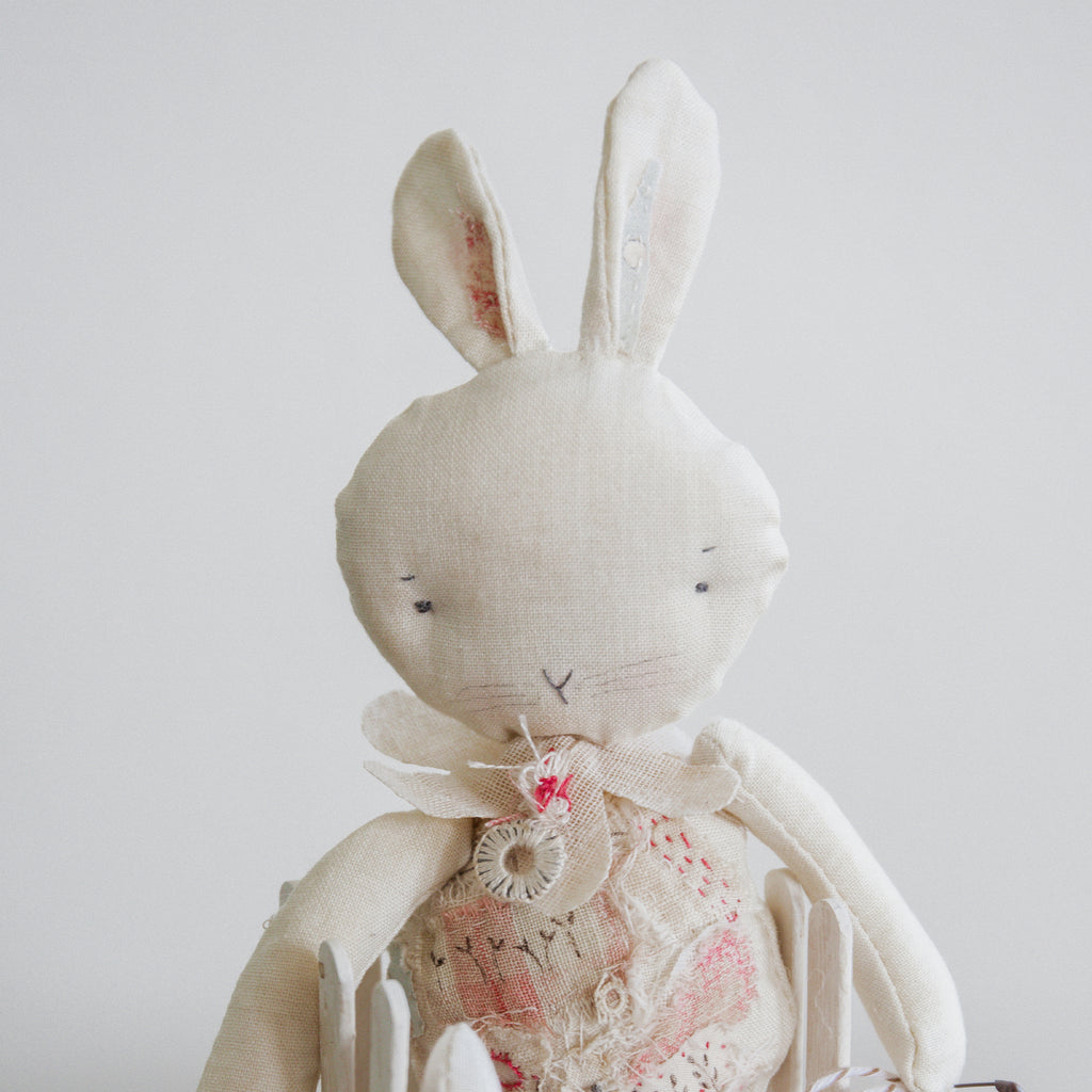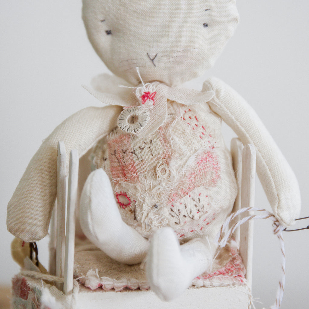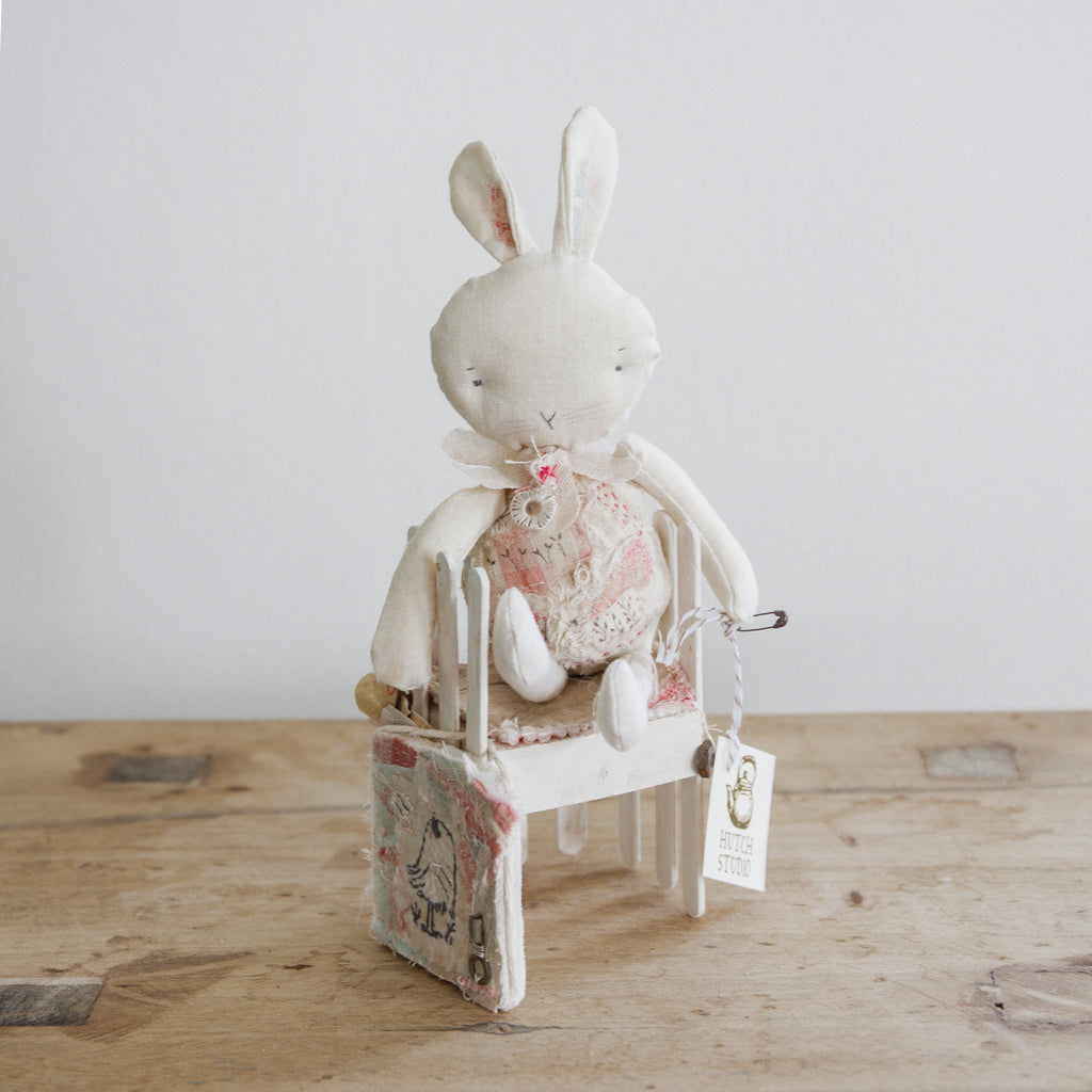 Sitting pretty in her cushioned garden chair is little bunny Nel.  Her gangly body is simple and sweet with a hand embroidered face.  Her tummy is a delicate patchwork of soft faded fabrics, tiny stitchwork and fabric art.  Around her neck is a stiff scalloped collar and a matching petal dangle from her arm.  A tiny piece of embroidered artwork hangs from her chair ready to be hung anywhere she chooses.