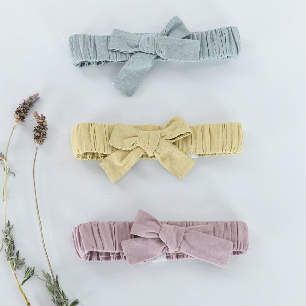 The cutest little headband that you ever did see, adorned with a bow, and in the softest organic fabric. Easily slips on baby's head, and stays put, with or without hair!