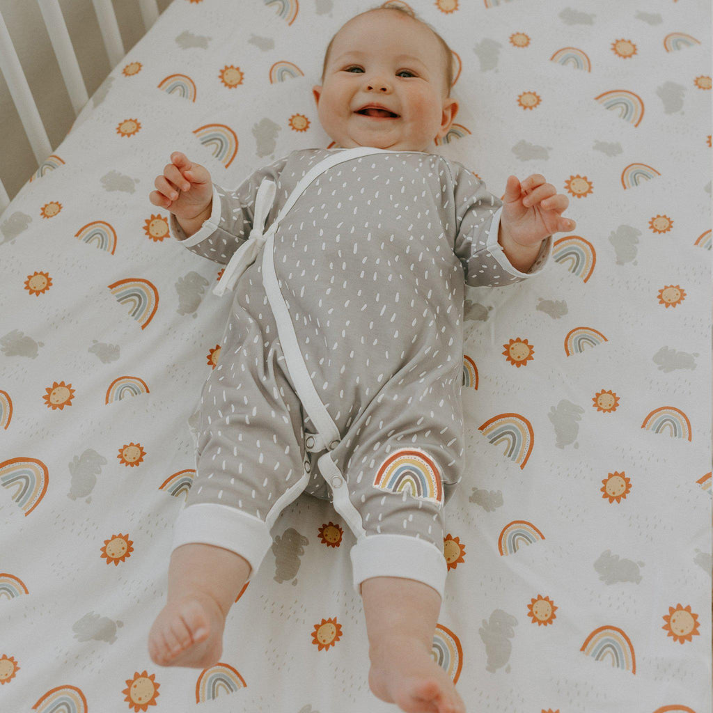 A perfectly sweet outfit for any little newborn, this cotton-knit kimono-style romper comes in a lovely soft grey with a screen-printed rainbow on the leg. The kimono tie closure and snap crotch make changing a breeze, and the soft, machine-washable fabric won’t irritate baby’s delicate skin! A perfect outfit for coming home from the hospital, or the inevitable “Sip and See” event!