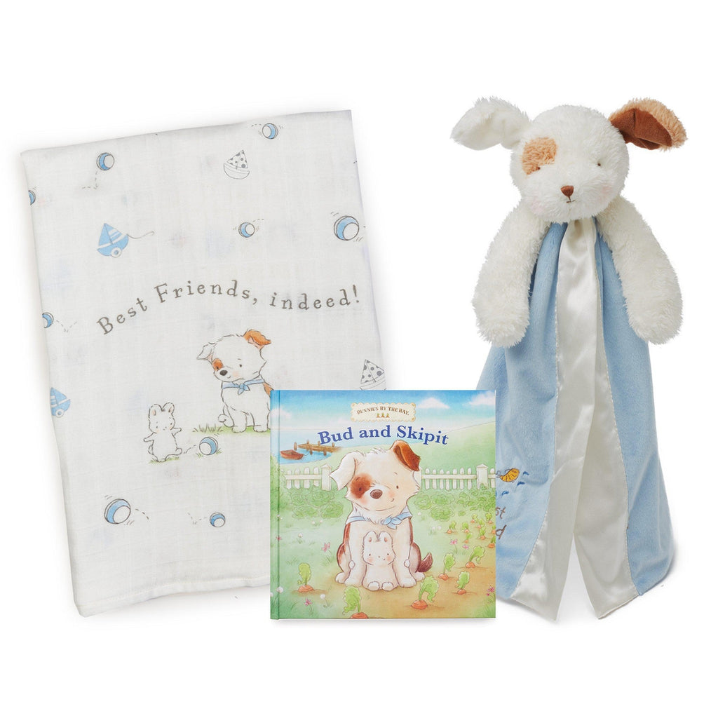 The perfect way to welcome baby with a blanket for swaddling, a lovey for snuggles and a book for story time. This gift set comes all bundle up in our signature Bunnies By The Bay gift box.